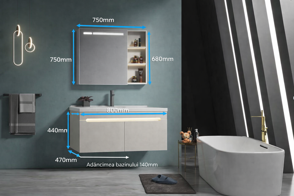 Include blat de 800 × 470 × 440 mm și dulap cu oglindă de 750 × 125 × 680 mm, fiind ideal pentru băile în care se dorește un spațiu bine organizat, luminos și elegant.