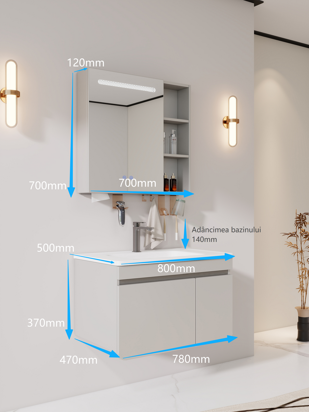 Include dulap bază cu uși duble, chiuvetă integrată ceramică și dulap cu oglindă smart,