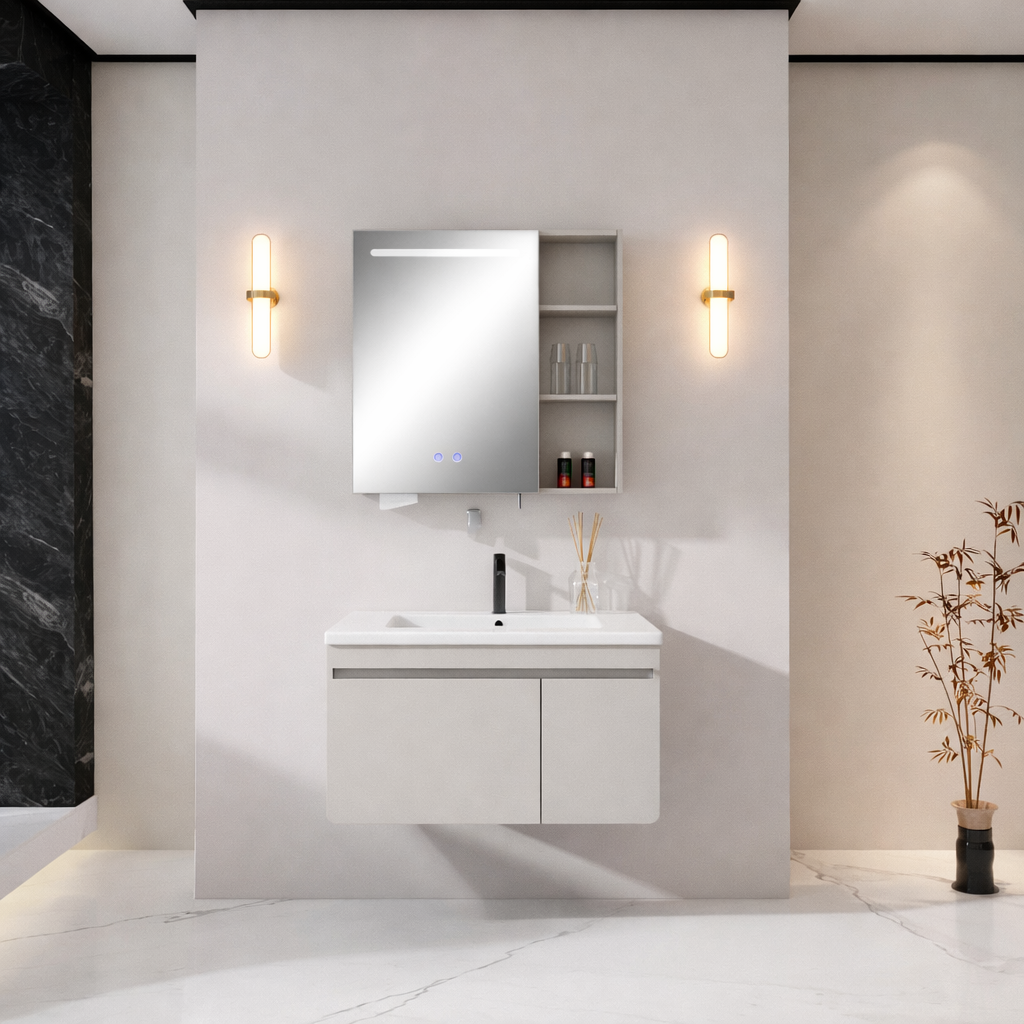 Set Mobilier Baie 80 cm Gri Crem cu Uși Duble și Dulap cu Oglindă Smart